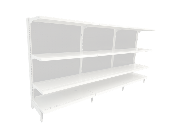 3 tramos de góndola de pared Sistema T con 3 entrepaños por tramo.